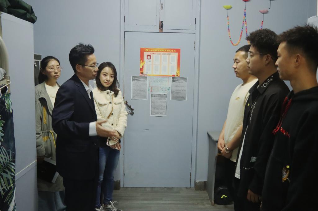 4月27日下午四点,党总支书记刘小龙、副书记钟梅、辅导员刘媛媛、郑娥走访慰问员工公寓,针对三月、四月份公寓卫生检查结果,授予31个“文明宿舍”流动红旗、3个“标杆宿舍”流动红旗。