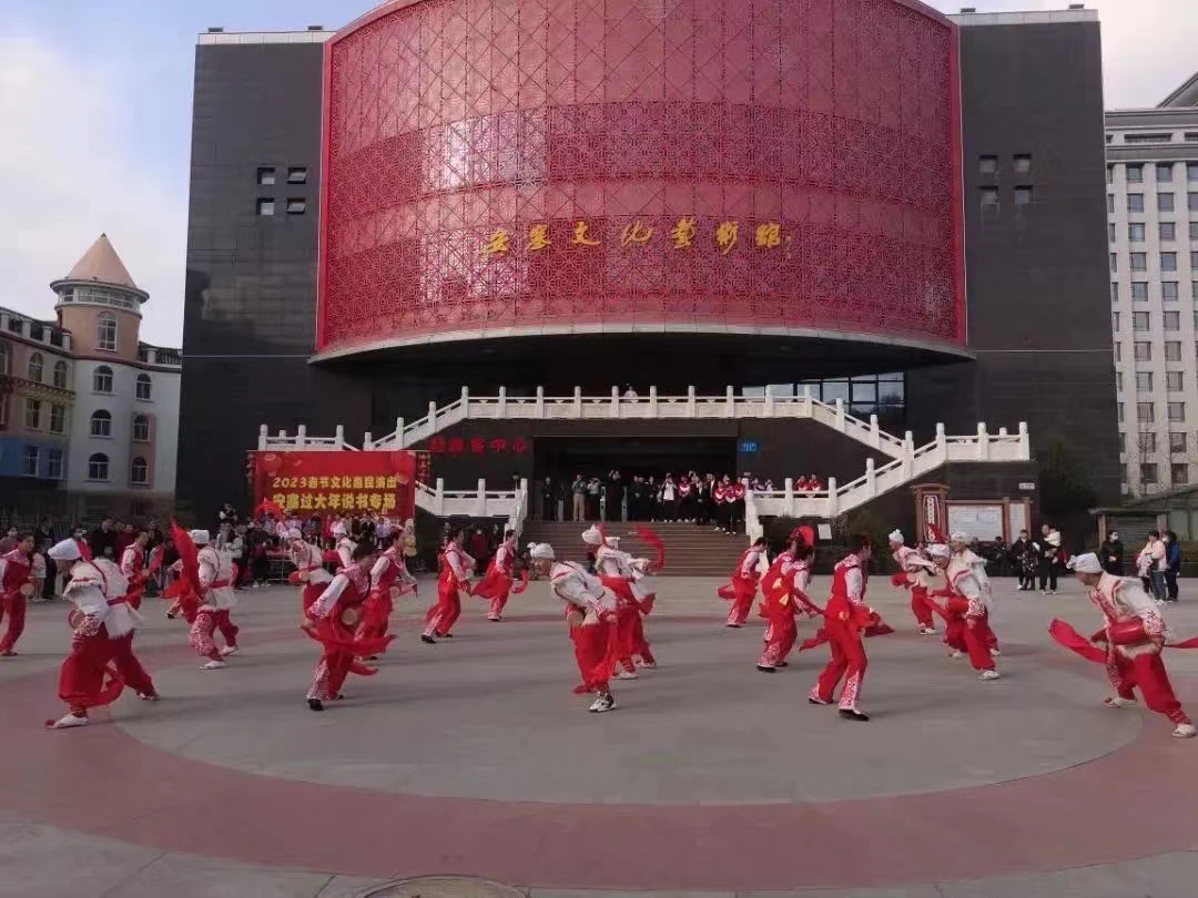 下午4点,师生到达素有“腰鼓之乡”美誉的安塞区,学习腰鼓、民歌、剪纸等艺术,在安塞区副区长孟晓琦的陪同下,在讲解员的引导下,参观了安塞区文化文物馆各大展区,师生倾听了关于安塞腰鼓、安塞剪纸、陕北民歌等艺术形式的精神特质和历史文化内涵。在安塞文化文物馆前的广场上,师生观摩学习了专业人员的精彩表演,对安塞腰鼓表演当中讲究“能”、“蛮”、“巧”等“五劲”有了更深的了解和领悟,为今后的表演及研究拓宽了思路。表演结束后,师生与表演者现场交流学习,共同探讨,为今后的合作交流奠定了基础。