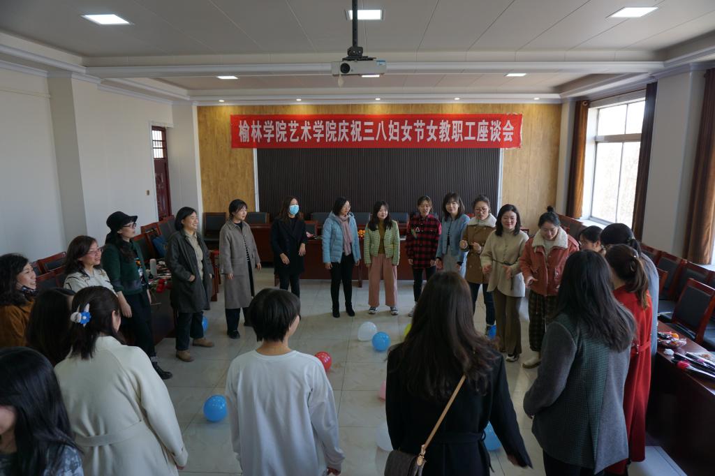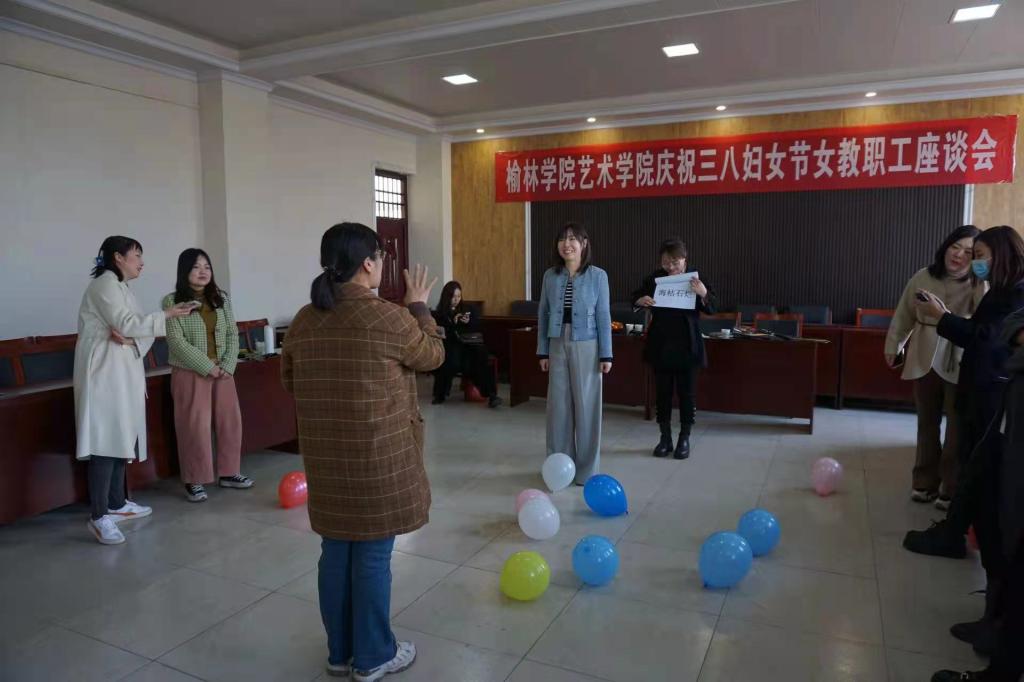 座谈会后,女教职工们共同参与了击鼓传花、你比划我猜、背靠背挤气球等娱乐活动。