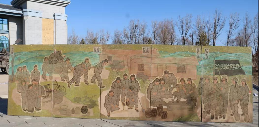 70多年来,榆阳儿女用智慧、汗水和生命,为毛乌素大沙漠披上了绿装,实现了从“沙进人退”到“绿进沙退”的历史性飞跃,谱写出一部战天斗地的治沙史诗。《无悔青春——榆林补浪河女子民兵治沙连》是k1体育马丽老师创作团队,以榆阳区补浪河女子民兵治沙连为主题创作的大型壁画,分为惜别离家、踏沙寻水、风吹脸庞、围灯习字、沙海新绿五部分。壁画以艺术化的表现方式,讴歌在共产党带领下,榆阳人民扎根沙海、感天动地的创业史、斗争史。