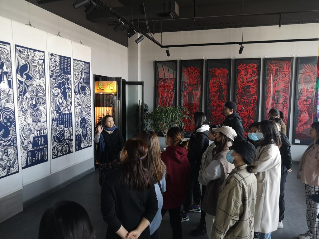 来到剪纸传承人钱凯老师家里,参观学习他剪纸艺术的魅力。钱老师家里布满了各种各样的剪纸作品,有可爱的小动物造型、逼真的人物画像、特色的陕北话等,画面形象,手法精细,物象生动,为他剪纸艺术工艺的精湛而叫绝。在钱老师的指导下我们一起动手亲身体验剪纸工艺的精细的技法与乐趣,这更加深了我们对剪纸工艺的认识与理解。